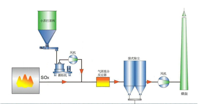 碳酸氢钠(小苏打, NaHCO3)可以用作烟气脱硫的吸附剂。它通过化学吸附去除烟气中的酸性污染物,同时,它还可通过物理吸附去除一些无机和有机微量物质。此工艺将碳酸氢钠细粉直接喷入高温烟气。在高温下碳酸氢钠分解生成碳酸钠Na2CO3、H2O和CO2。
